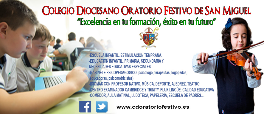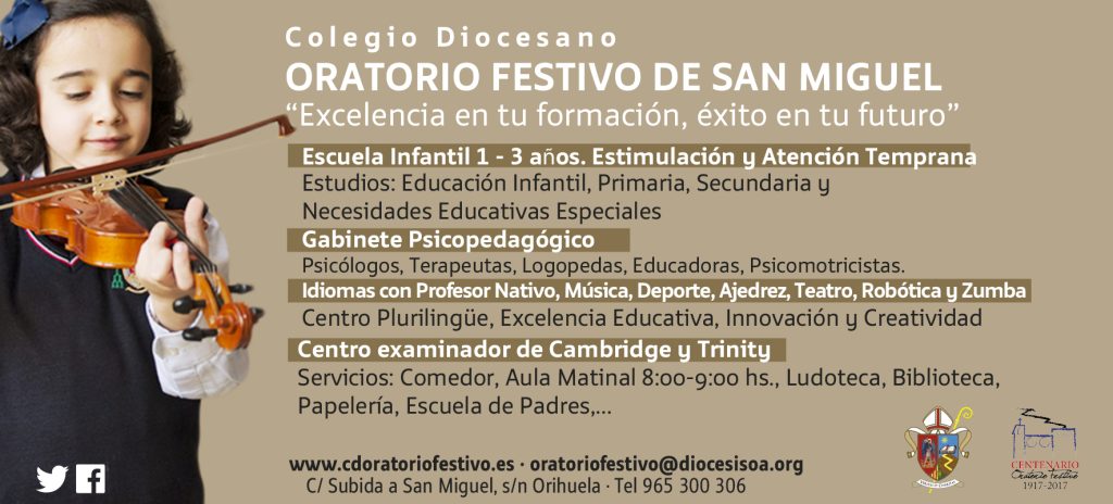 El colegio Oratorio Festivo de San Miguel lleva ya más de 100 años educando y sirviendo en el corazón de la ciudad de Orihuela. La clausura de la celebración de su primer centenario tuvo lugar el pasado mes de octubre de 2018. Todo un programa de actividades educativas, culturales, religiosas, deportivas y festivas conmemoraron su primer siglo de existencia a lo largo de dos cursos académicos. Excelencia en tu formación. Éxito en tu futuro Un Proyecto Educativo, que abarca desde infantil de 1 año hasta 4º de Educación Secundaria Obligatoria y unos resultados que marcan la diferencia hacen de este colegio un pionero y vanguardista en innovación educativa, en una pedagogía de excelencia, en la enseñanza de idiomas, en creatividad, en métodos de trabajo y en la educación personalizada de todos sus alumnos. Entre otros muchos logros, el Oratorio ha sido reconocido oficialmente como Centro Plurilingüe, Promotor de la Actividad Física y la Salud, de Calidad Educativa, que emprende y desarrolla proyectos de atención al desarrollo infantil, de estimulación sensorial y aprendizajes tempranos, de atención, inclusión y normalización de alumnos con Necesidades Educativas Especiales, y que lleva a cabo programas europeos como Euroscola, eTwinning y Erasmus+, por los que ha recibido sellos nacionales y europeos a la excelencia. Distinguido también como centro preparador y examinador de inglés por Cambridge y Trinity, de alemán, con certificaciones oficiales, en el Oratorio Festivo se considera igualmente la formación musical, deportiva, científica, tecnológica, digital y artística como pilares esenciales para enriquecer el currículum de nuestros educandos. Sobresaliente por los premios, posiciones y calificaciones que alcanzan sus alumnos en pruebas y concursos escolares matemáticos, literarios, deportivos, de debate y dibujo, como en los estudios superiores y en las carreras profesionales que emprenden después. Diocesano con impronta Salesiana El Oratorio se distingue, como colegio católico, por su carácter salesiano, con un modelo educativo que pone su mayor énfasis en la formación de sus niños y jóvenes en valores humanos y virtudes cristianas, inspirada en los principios y orientaciones de la Iglesia Católica. Desde el centro se acompaña y orienta de manera continua a las familias en el proceso de enseñanza/aprendizaje de sus hijos, en su desarrollo, evolución y maduración, a través de la tutoría personalizada, para fomentar y conseguir conjuntamente el trabajo, el esfuerzo, la constancia, la responsabilidad y el respeto de los que serán el futuro de nuestra sociedad. Más de un siglo sembrando saber Gracias a la ilusión, al esfuerzo, a la competencia y compromiso común de todos los profesionales que forman y han formado parte de este centro educativo a lo largo de sus más de 100 años de historia, trabajando en un equipo abierto a la sociedad, pendiente de sus cambios y transformaciones, en continua formación, es posible ofrecer este Proyecto Educativo actual. En definitiva, las familias que escogen nuestro centro brindan la posibilidad a sus hijos de que emprendan y desarrollen las más variadas y completas actividades complementarias y que disfruten de unos servicios que logran el ambiente escolar acogedor, cercano y familiar tan característicos del Oratorio Festivo de San Miguel.