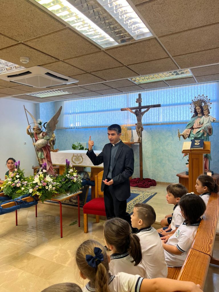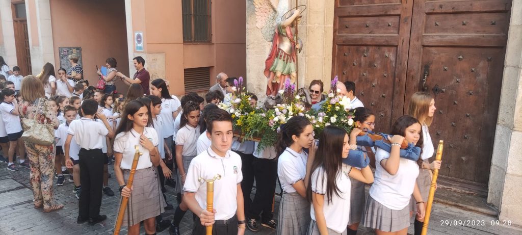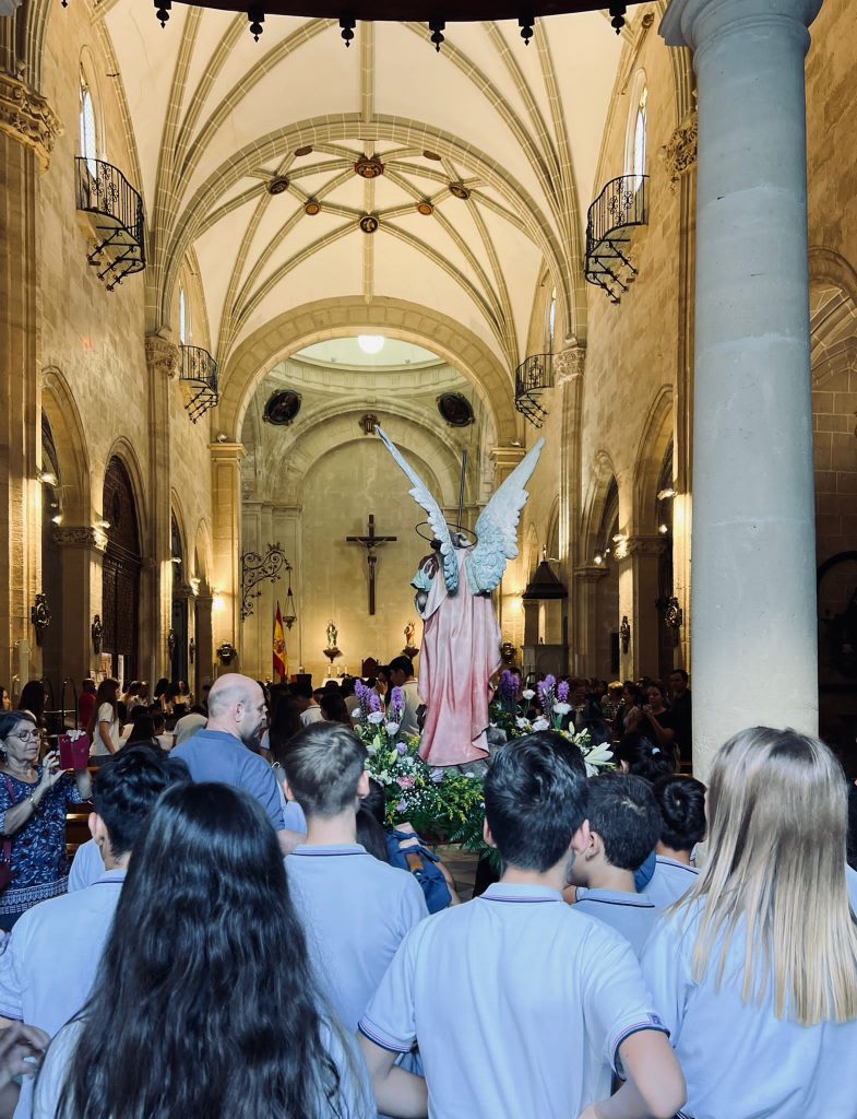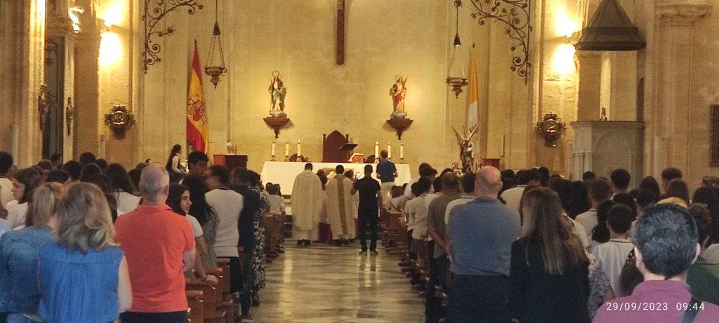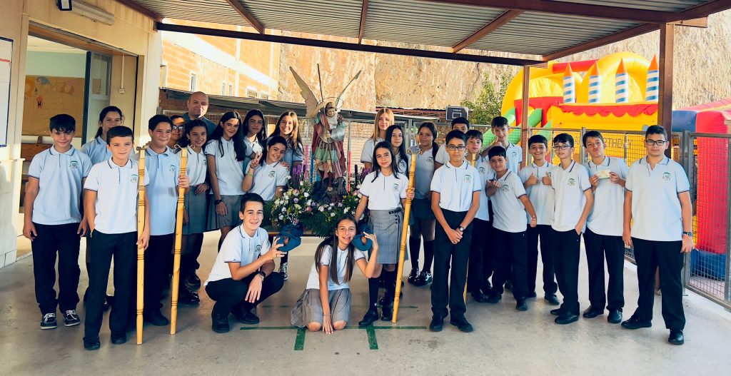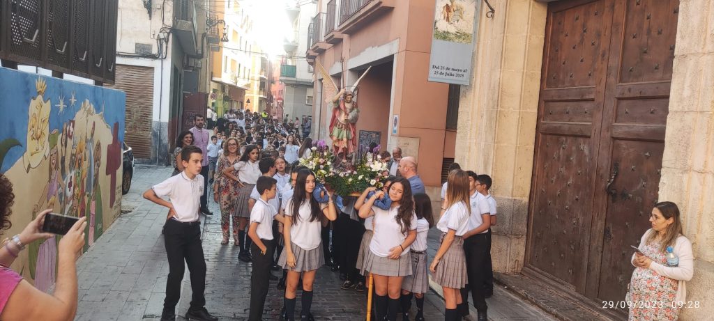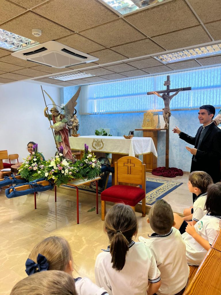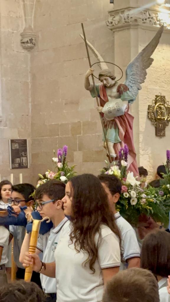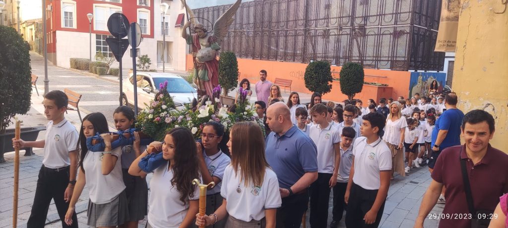 Por primera vez, nuestra comunidad educativa acompaña en romería la imagen de San Miguel que veneramos en la capilla, hacia la Iglesia Parroquial de las Santas Justa y Rufina. Allí nuestro director titular, el Padre Marcos celebra la Eucaristía acompañado por D. Jesús Rosillo, director del Colegio Diocesano Santo Domingo.